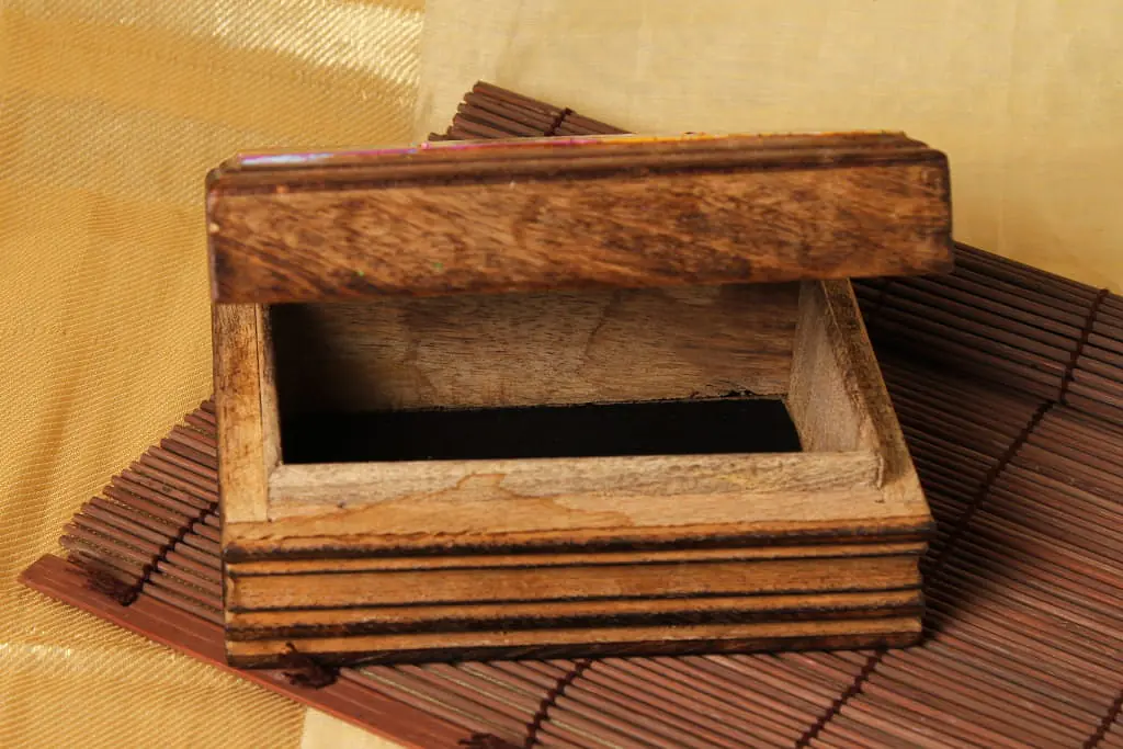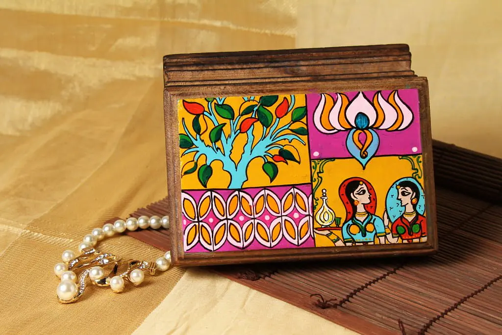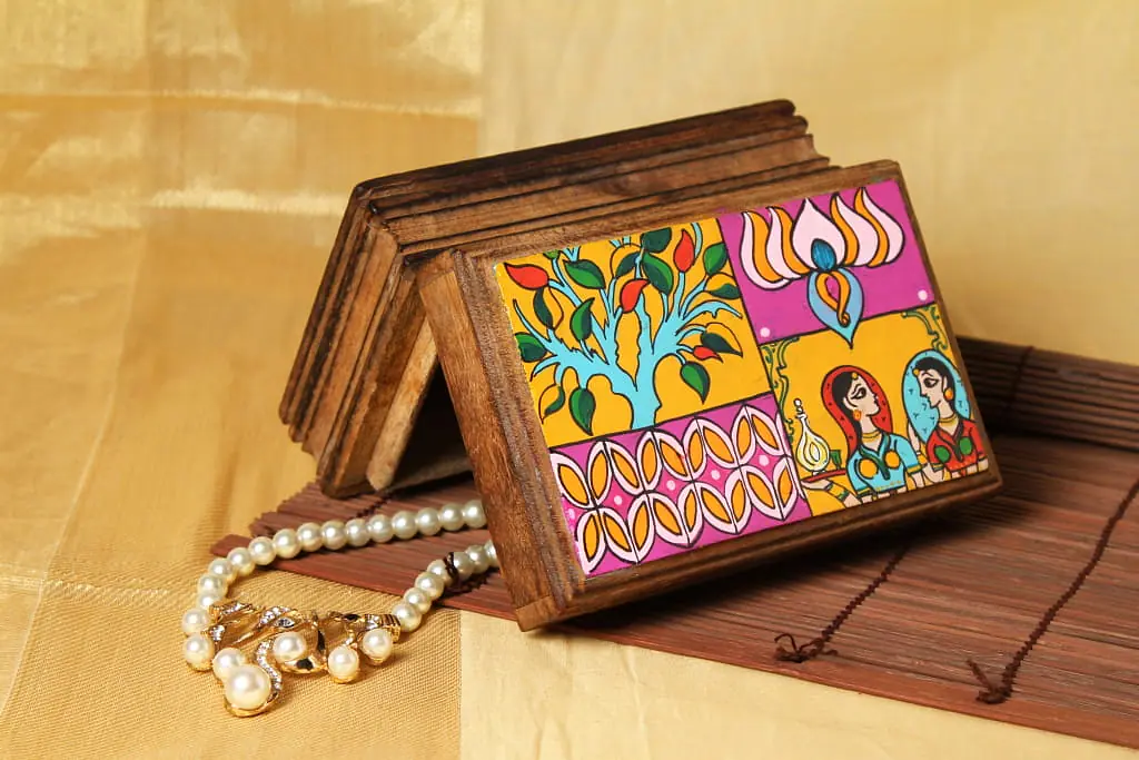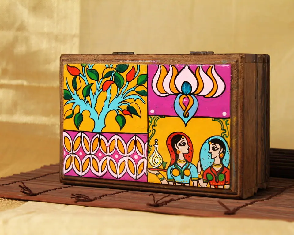 Description : This is a wooden Trinket Box where the designs are inspired by the Mughal Designs and colors
