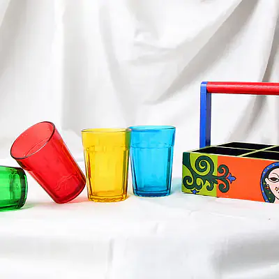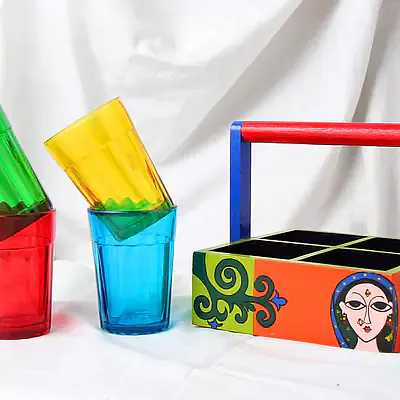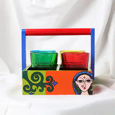 Description : Product contains a Designer Hand painted wooden stand and 4 colored glasses. Ready for daily and rough use. Each Glass Measures approx 90 Ml.