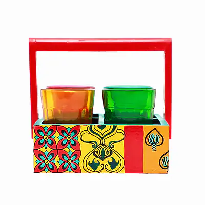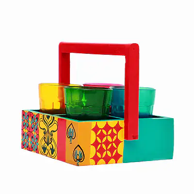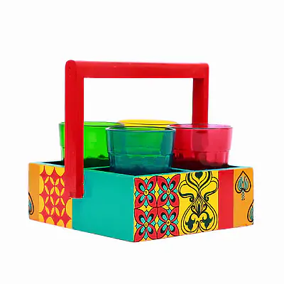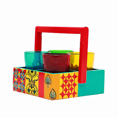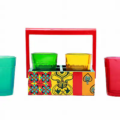 Description : Product contains a Digitally Designed and Printed Tea Glass Wooden Stand and 4 colored glasses.
