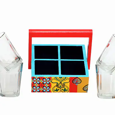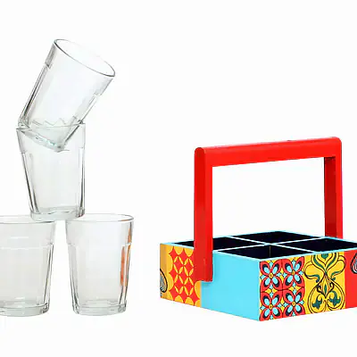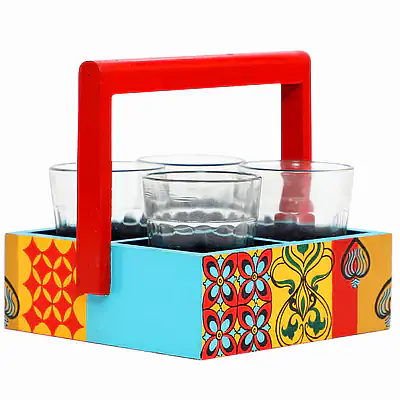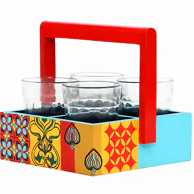 Description : Product Contains 4 hand designed designer Printed Glasses along with the Stand. Product is painted at multiple layers along with protective coating to make it very robust and ready for daily use. Each Glass Measures approx 90 Ml.