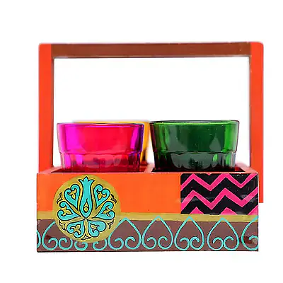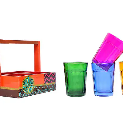 Description : Product contains a Hand Designed and Printed Wooden Stand and 4 Colored glasses. Ready for daily and rough use.