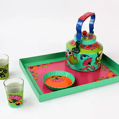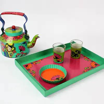 Description : Product consists of Designer Hand Painted Aluminum kettle, Serving Tray and a Cookie plate. Top coat done to protect the art work and is ready for daily use. All Colors and top coating used are food safe, odour less, En 71.3 compliant qualifies best European standards.