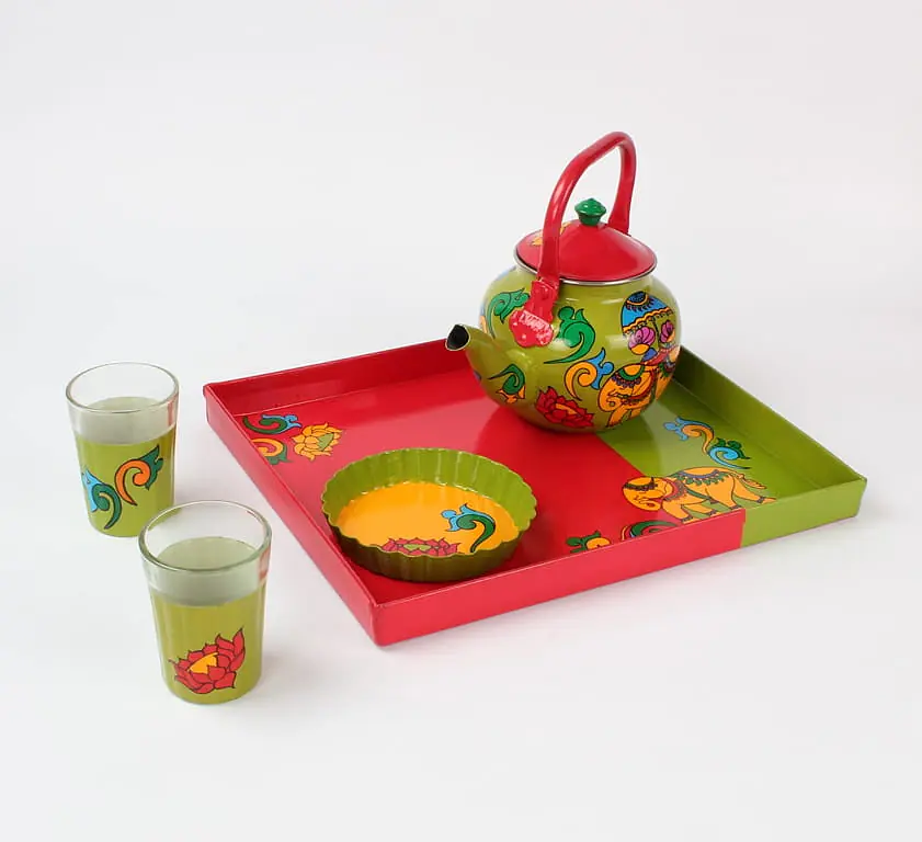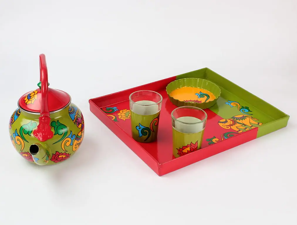 Description : Product consists of Designer Hand Painted Stainless Steel Kettle, Aluminum Serving Tray and a Cookie plate. Top coat done to protect the art work and is ready for daily use. All Colors and top coating used are food safe, odour less, En 71.3 compliant qualifies best European standards.
