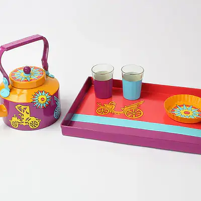 Description : Product Contains a Hand Painted Designer Aluminum Kettle measuring approx 1.5 ltr capacity , Two Tea Glasses , A Bowl and A Tray.
