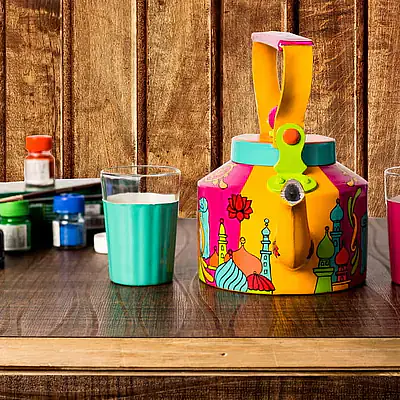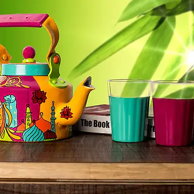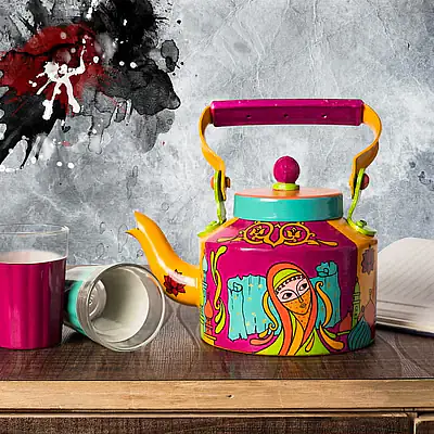 Description : Product Contains a Hand Painted Designer Aluminum Kettle and two painted glasses. The Art work is done on multiple layers and then coated with a protective layer to make it ready for daily serving. Use with any Hot & Cold serving. All Colors including top coat used are food safe, odour less, En 71.3 compliant qualifies best European standards. Kettle Measures 1.5 Ltr and Glass approx 90 Ml.