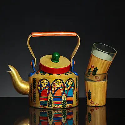 Description : Product Contains a Hand Painted Designer Aluminum Kettle and two painted glasses. The Art work is done on multiple layers and then coated with a protective layer to make it ready for daily serving. Use with any Hot & Cold serving. All Colors including top coat used are food safe, odour less, En 71.3 compliant thus qualifies best Europian standards. Kettle Measures 1 Ltr and Glass approx 90 Ml.