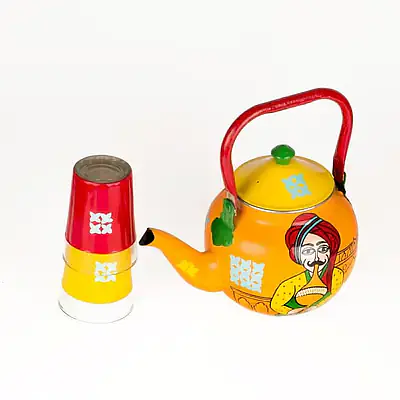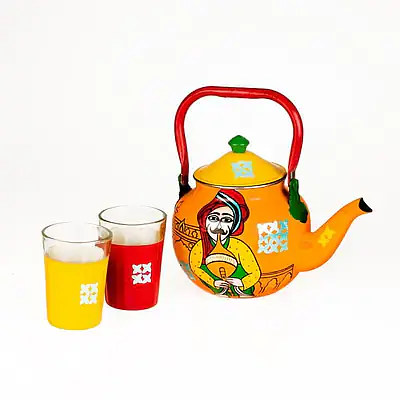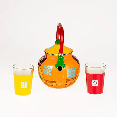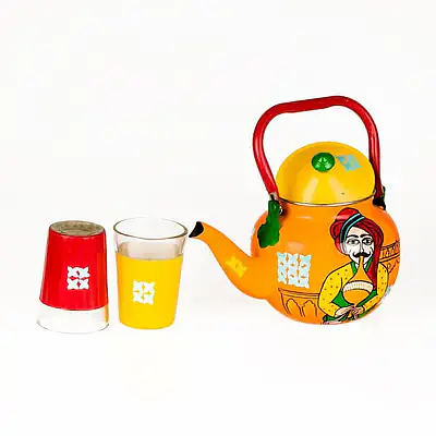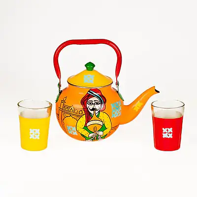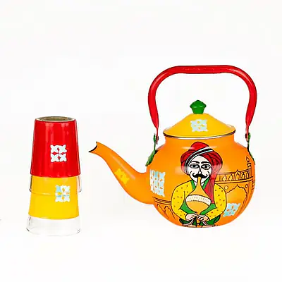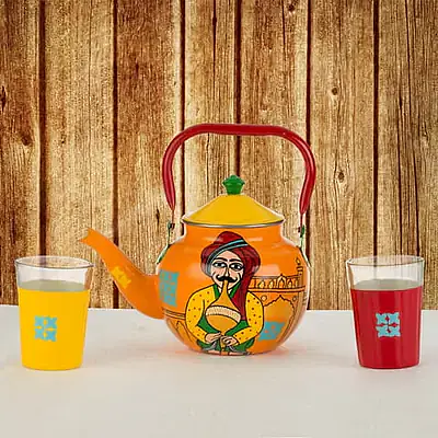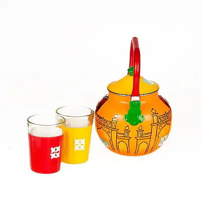 Description : Product Contains a Hand Painted Designer Stainless Steel Kettle and two painted glasses. The Art work is done on multiple layers and then coated with a protective layer to make it ready for daily serving. Use with any Hot & Cold serving. All Colors including top coat used are food safe, odour less, En 71.3 compliant qualifies best European standards. Kettle Measures 1 Ltr and Glass approx 90 Ml.
