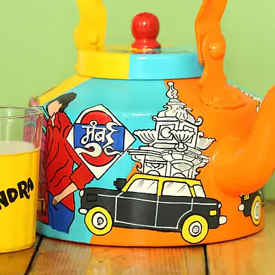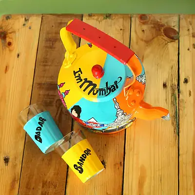 Theme : Mumbai is the city of dreams. Here the kettle has images of kaali peeli taxi, Big B, Gate of India & the glasses have names of the two most famous station i.e Bandra & Dadar which symbolise everything that is Mumbai.