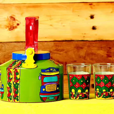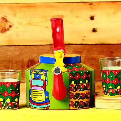 Theme : In India no journey is complete without spotting a truck painted in bright colour & vibrants designs. Here the kettle has such a truck & glasses are enrobed by vibrant ethnic design.