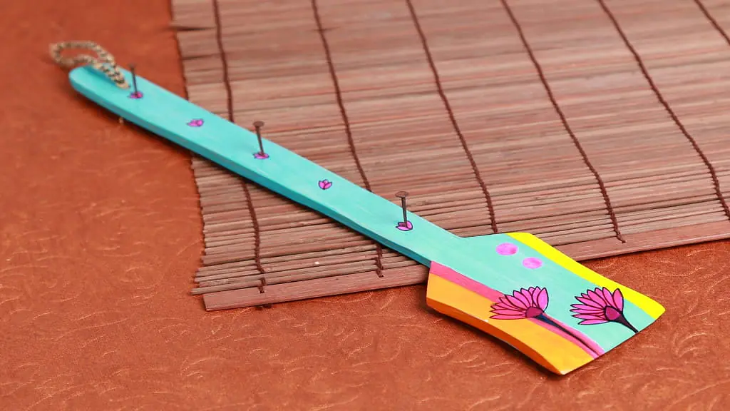 Description : This is a hand Painted wooden spatula coated with Protective coat and steel hooks to hang multiple keys. Designs acts as a souvenir item too.