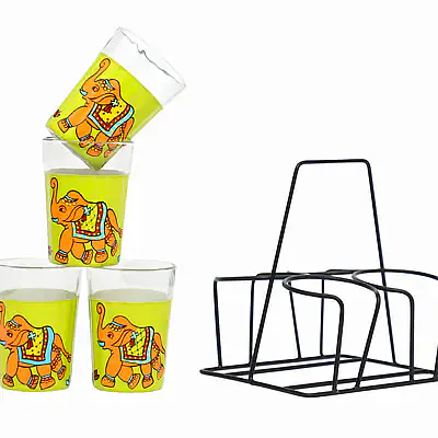 Description: Product Contains 4 hand designed designer Printed Glasses along with the Stand. Product is painted at multiple layers along with protective coating to make it very robust and ready for daily use. Each Glass Measures approx 90 Ml.