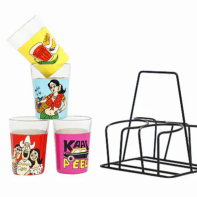Description: Product Contains 4 hand designed designer Printed Glasses along with the Stand. Product is painted at multiple layers along with protective coating to make it very robust and ready for daily use. Each Glass Measures approx 90 Ml.