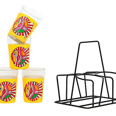 Description: Product Contains 4 hand designed designer Printed Glasses along with the Stand. Product is painted at multiple layers along with protective coating to make it very robust and ready for daily use. Each Glass Measures approx 90 Ml.