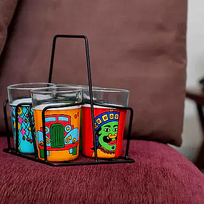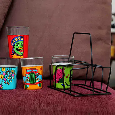 Description: This product is a set of four (04) hand designed, printed cutting chai glasses (Tea Glasses) with a traditional stand. These designer glasses are a combination of a versatile and colourful designs and makes the product very luring to sip the tea in it.