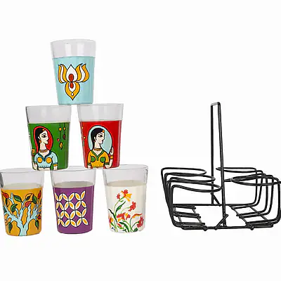 Description : Product Contains 6 designer Hand Painted Glasses along with the Stand. Product is painted at multiple layers along with protective coating to make it very robust and ready for daily use.