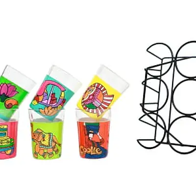 Description : Product Contains 6 designer Hand Painted Glasses along with the Stand. Product is painted at multiple layers along with protective coating to make it very robust and ready for daily use. Each Glass Measures approx 90 Ml.