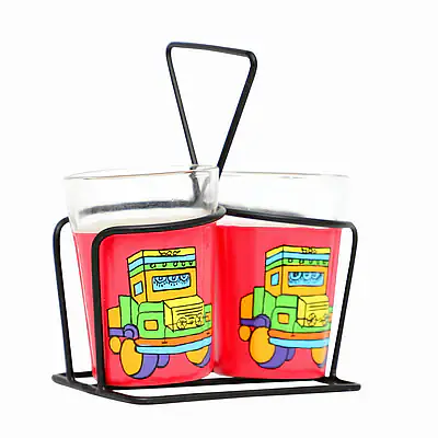 Description: Product Contains 2 hand designed designer Printed Glasses along with the Stand. Product is painted at multiple layers along with protective coating to make it very robust and ready for daily use. Each Glass Measures approx 90 Ml.