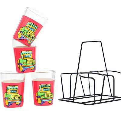 Description: Product Contains 4 hand designed designer Printed Glasses along with the Stand. Product is painted at multiple layers along with protective coating to make it very robust and ready for daily use. Each Glass Measures approx 90 Ml.