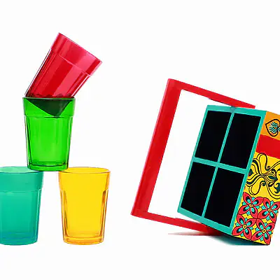 Rustic Mutlicolour Wooden Tray with 4 ceramic glasses
